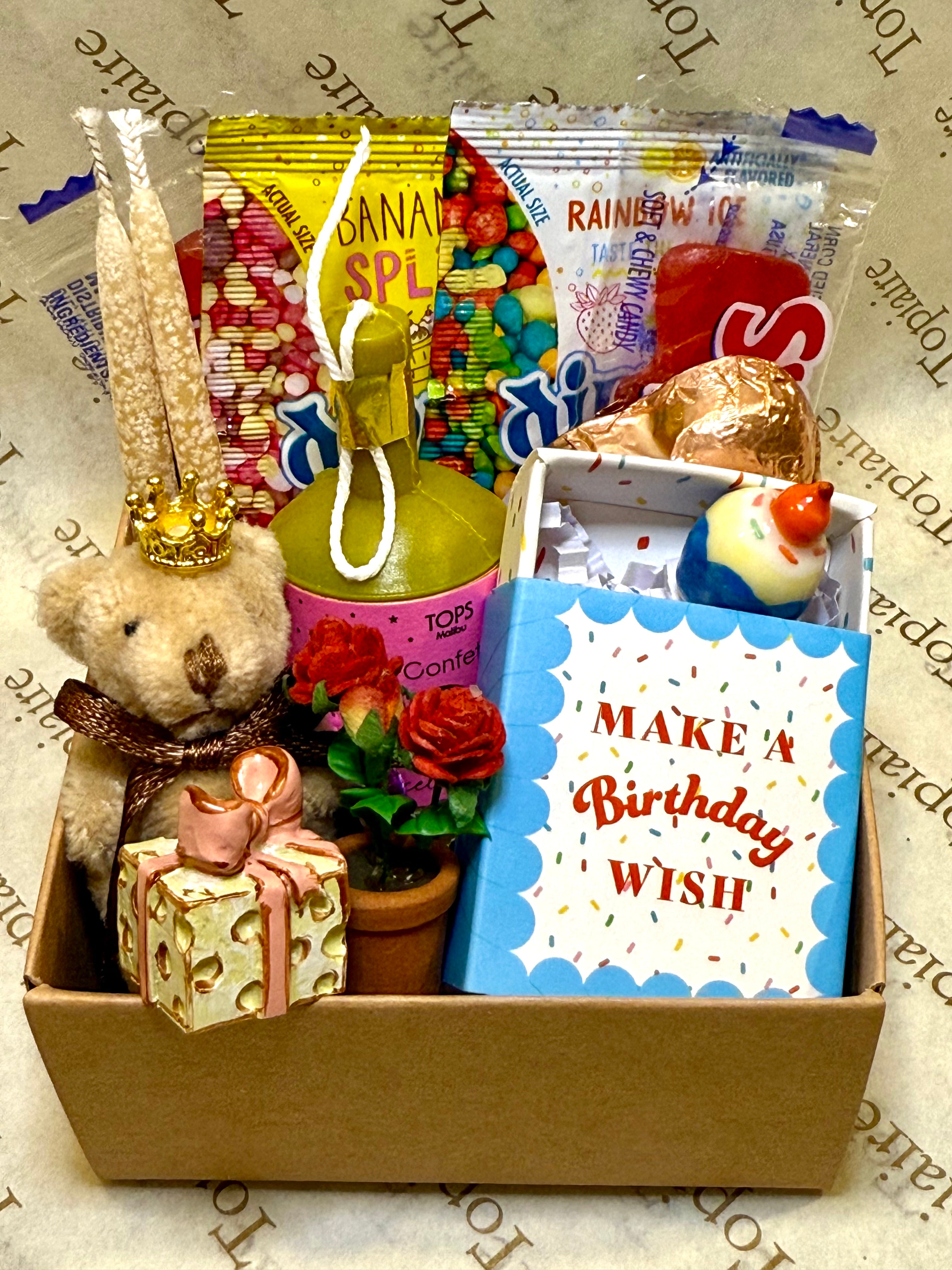 3 inch box filled with birthday treasures. Mini teddy bear, candles, penny candy